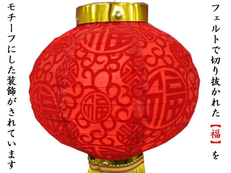 ランタンとは中国風の提灯のことです。もともとは照明器具でしたが、現在では中国のイメージがあると言うので、店舗装飾や催事の飾りつけなどに良く使用されます。建物や部屋の出入り口などに基本的には左右に一対で飾ります。本商品は紅地にフェルトで切り紙風に【福】が装飾された、ぱっとみ少し豪華に見える布製ランタンです。中華料理店など店舗装飾や、ドラマや舞台の小道具、イベントの飾りなどにご使用下さい。
