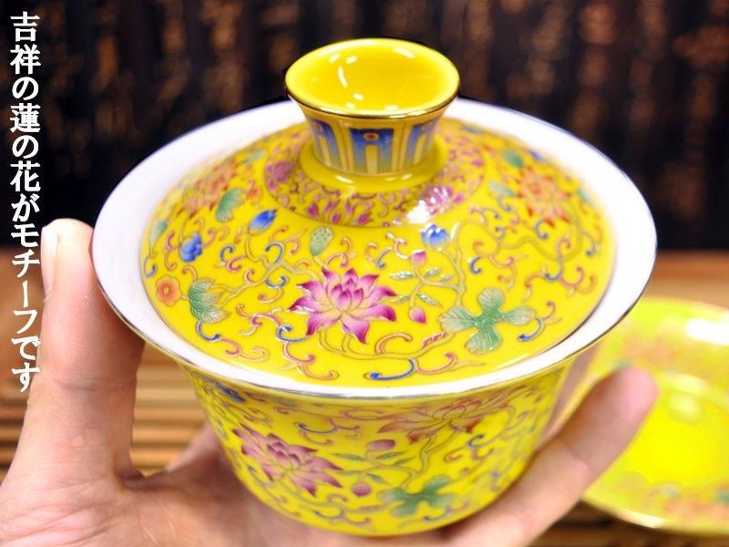 蓋碗とは、功夫茶用の蓋付きの湯飲みのことです。茶葉の性質により色々な淹れ方が有りますが、とりあえず茶葉を入れて、湯を注ぎ、蓋をして茶葉が開くまで少し蒸らすだけで、お手軽に美味しい中国茶が飲めます。本商品は鮮やかな黄色が目を惹く少し大型の蓋碗です。人気の吉祥蓮花をモチーフにしたデザインです。女性の手には少し大きめです。蓋碗のコレクションに、また茶架に飾って中華料理店などのディスプレイにも!