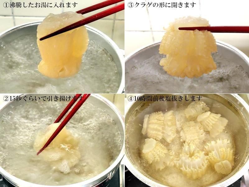 軽く水洗いし、100度の沸騰した熱湯の中に入れます。箸などでかき混ぜ15〜20秒で引き上げ、ボール等の容器に水を入れくらげを浸け一晩脱塩します。10時間前後で塩は抜けます。塩が抜けたらすぐに料理に使えますが、水を取り替え、5〜10時間位浸けるとプリプリ感が出ます戻り切るまで戻すと20時間位で戻り切ります。