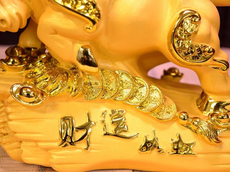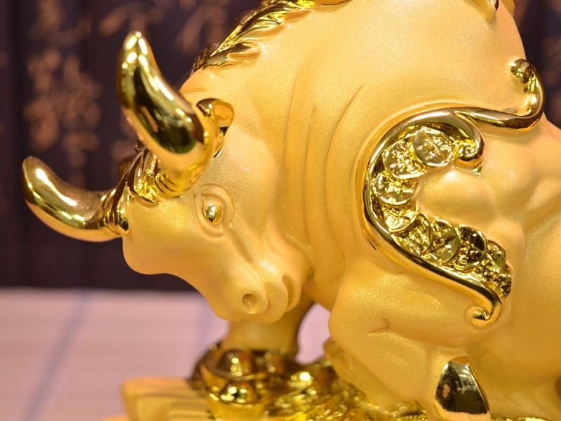 中国では牛は威厳や威力の象徴として、親しまれている動物です。また一方では勇猛さのシンボルともされています。日本でも平安の時代などから高貴な動物としてあがめられてきました。本商品は金沙工芸仕上げの金の牛の置物です。牛の気勢の良さにかけて「財運如虹」、財運が向上すると言われる縁起の良い置物です。オフィスや中華料理店の風水インテリアに!