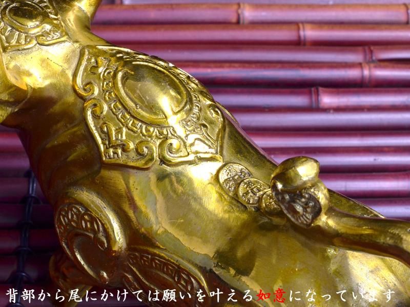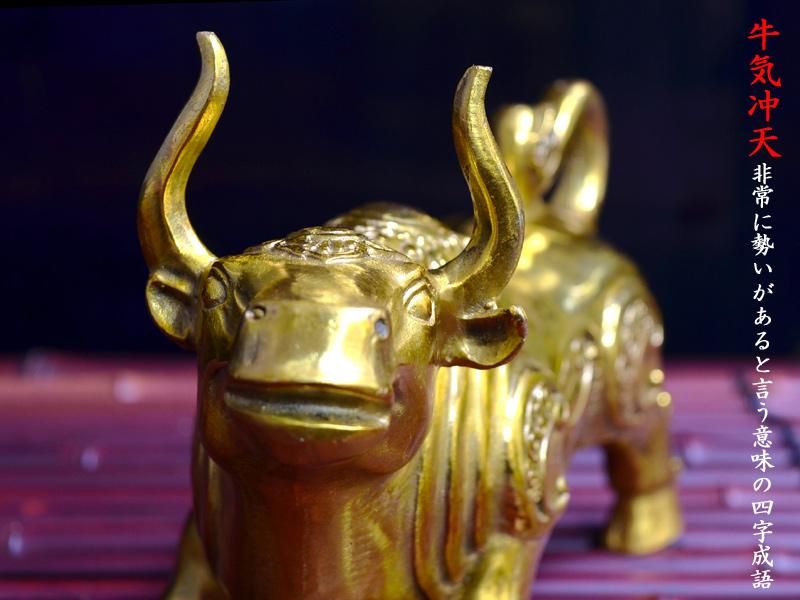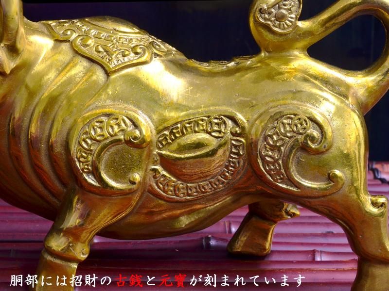 中国では牛は威厳や威力の象徴として、親しまれている動物です。また一方では勇猛さのシンボルともされています。本商品は銅製の招財牛の置物です。尻尾で願いを叶える如意を表わし、側面には招財元寶が刻まれています。オフィスや店舗などの入口に飾っておくと、お客を招き、商売繁盛をもたらすと言われる縁起の良い置物です。