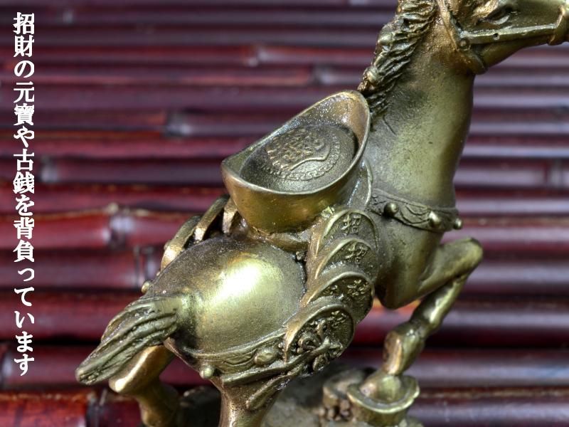 本商品は【招財】の元寶と沢山の古銭を身にまとい、足下にも元寶などの財宝を沢山溜め込んだ招財の馬の置物です。中国では銅の馬は運気の向上をもたらし、物事がスムーズに達成できる(馬到成功)と言われています。仕事運も上昇、また健康運にも良いと色々と言われています。 南の方角(十二干の午の方角)に置くと財運が高まるとも言われています。