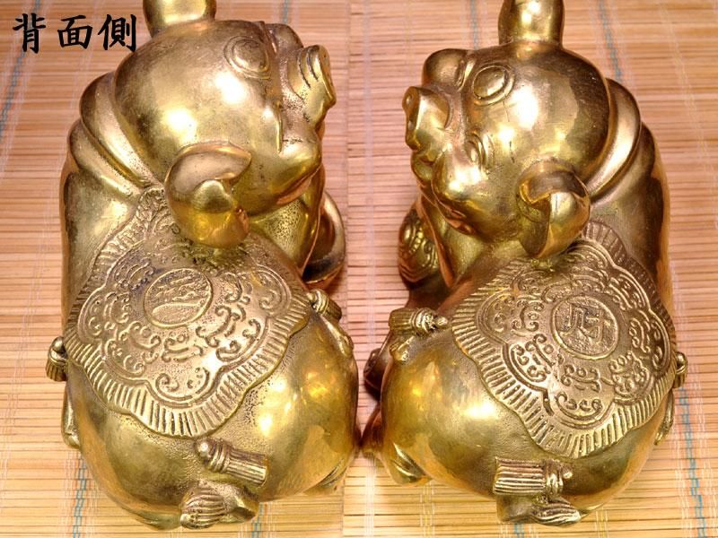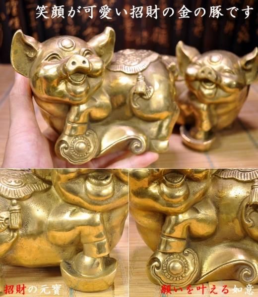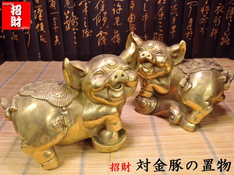 中国では野生の豚には魔除けの力があるとされていました。家畜化が進むと財産としての価値が進み、富の象徴として、中国では豚の置物は招財効果があるとして人気があります。 本商品は招財の元寶、願いを叶える如意に乗った可愛いペアの金豚の銅製の置物です。笑顔の豚は笑い豚と呼ばれ、福を招くとも言われています。オフィスや中華料理店などのインテリアにもおすすめです!