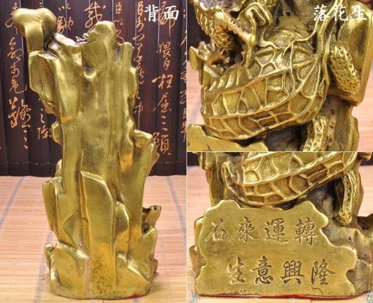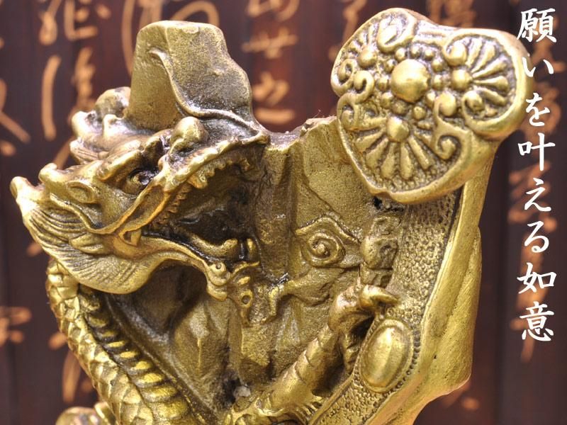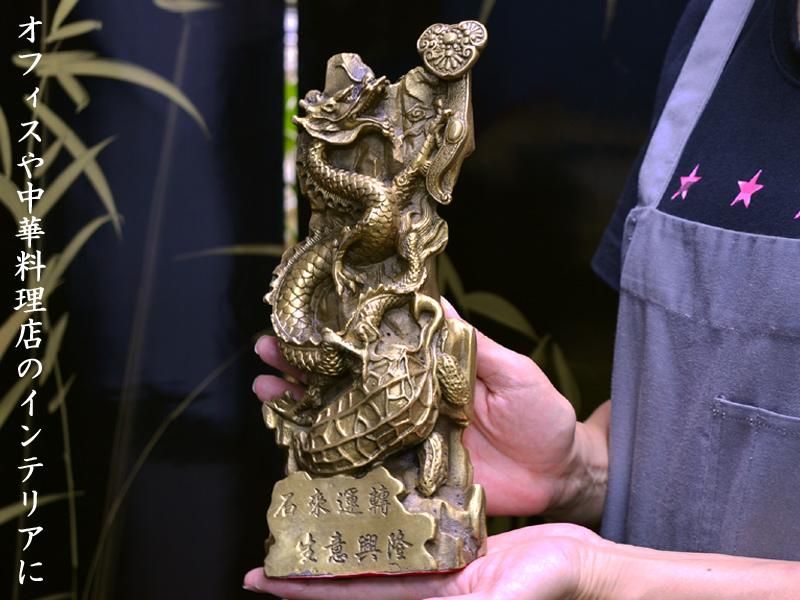 大地には龍脈と言って地球のエネルギー(気)が通る道が有ります。人間で言う血管のようなものですが、この龍脈を探し当てるのが、古来風水師の役割でした。山中にある龍脈に沿って、龍が龍珠を得るという山水龍のモチーフは、現在でも大変人気があります。本商品は片手に「如意」、片手に「落花生」を持つ銅製龍の置物です。風水において「如意」は願いを叶えるモチーフ、「落花生」は商売繁盛をもたらすモチ―フとされています。台座の「石来運轉」とは「石=時」(読みが同じ音)で「時が来て運が転じる」と言う意味です。オフィスに飾ると事業発展、中華料理店などの店舗に飾ると商売繁盛をもたらすと言わける吉祥の置物です!