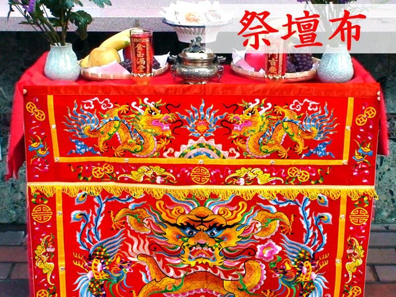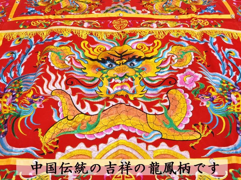 中国でお祭りの際にお供えを備える机を飾る祭壇布(卓囲)です。中国獅子舞などでも使用されます。一般に龍などの中国をイメージさせるモチーフが多く、中華料理店などの店舗装飾やイベントの飾り付け、テレビのバラエティーの小道具などにも使用されます。本商品は伝統的な皇帝五爪龍が刺繍された吉祥の龍鳳柄の祭壇布(卓囲)です。