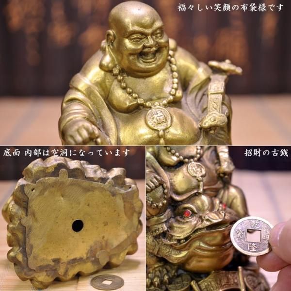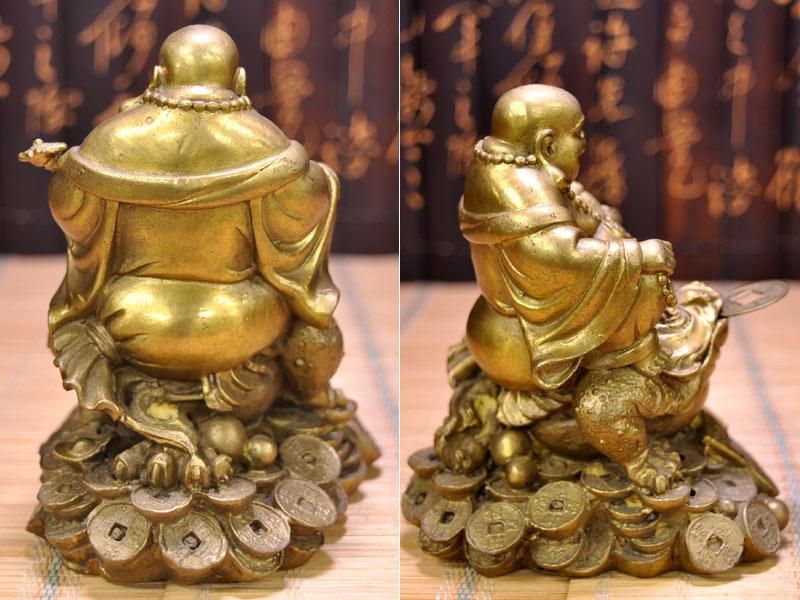 本商品は背に招財の布袋様を乗せた銭蛙の置物です。布袋様は招財・招福のシンボルで、何とも欲張りな置物です。オフィスや中華料理店などのインテリアにもお勧めです!