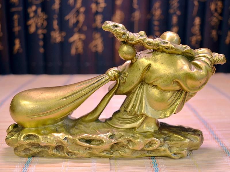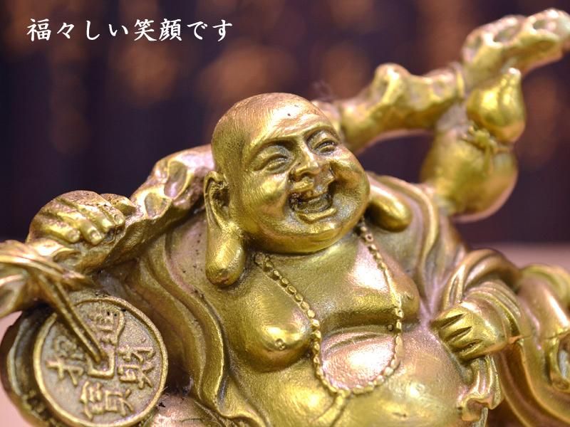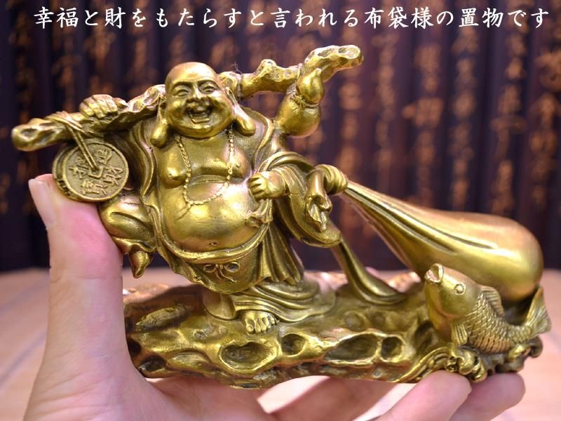 布袋(ほてい)は唐代に実際に存在したと言われる佛僧で、さまざまな伝説を残し、後代弥勒菩薩の化身と言われるようになりました。そのため中国では布袋を弥勒と呼ぶことがあります。本商品は福々しい笑顔の銅製の布袋像です。布袋様の代名詞、大きな堪忍袋を引き、その前には縁起の良い鯉(魚は余ると発音が同じなため)が跳ねています。背負った杖の右手には招財の古銭、左肩には魔除けの瓢箪とおめでたいシンボル満載の置物です。中華料理店や商店、オフィスなどに商売繁盛のインテリアとして人気がございます。