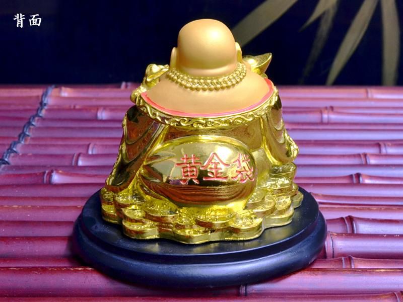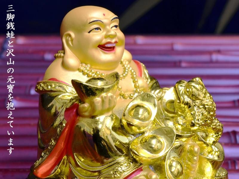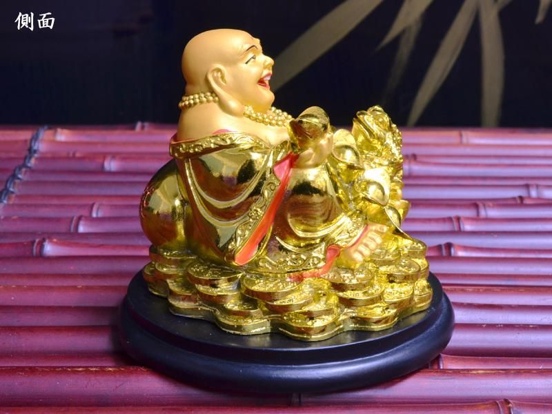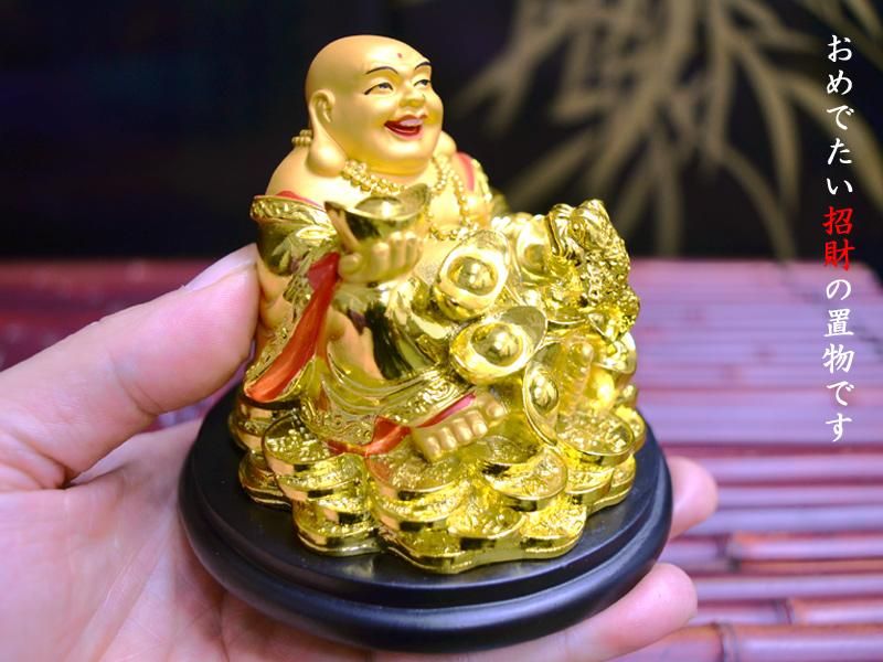 その名の由来となる大きな袋を背負い、堂々たる太鼓腹が特徴の布袋様は、実際に存在した僧侶だと言う節も有りますが、日本では七福神の一柱、福の神として有名です。商売繁盛のご利益があるとのことで店舗の装飾にも人気が有ります。本商品は沢山の古銭や元寶の上に鎮座する招財の金布袋の置物です。招財の銭蛙も一緒に乗っています。飾っておくと財を呼び込んでくれると言われています。