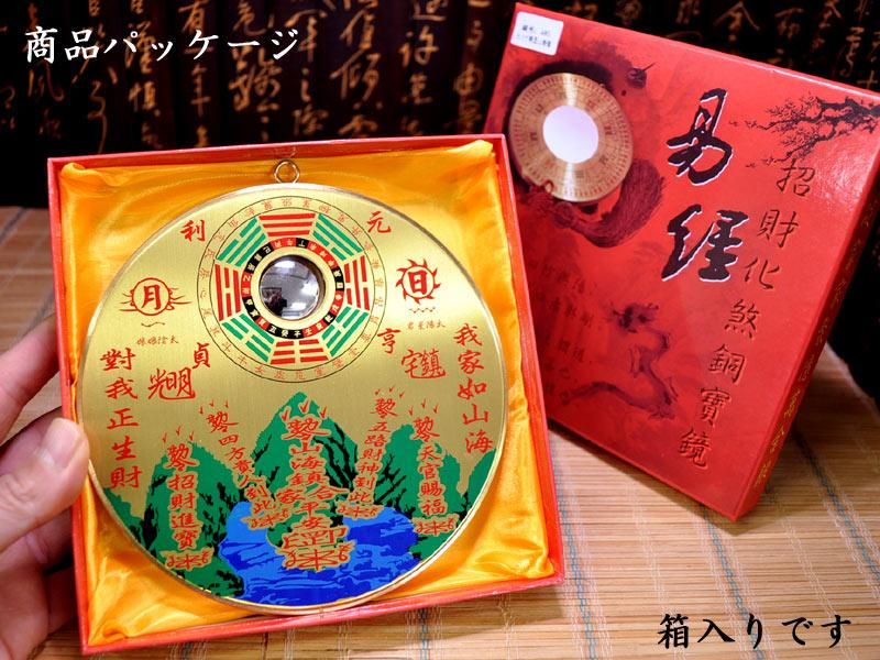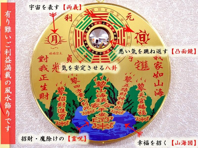 悪い気を跳ね返す魔よけの【凸面鏡】に、宇宙をイメージした【両義図】、幸福を招く【山海図】、気の安定をもたらす【八卦図】、招財・魔除けの【呪符】など、これでもかと詰め込んだ開運アイテムです。