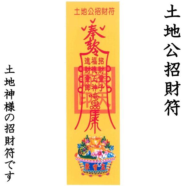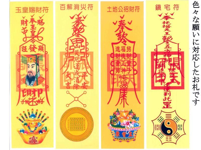 霊符(れいふ)とは中国道教で使用されるお札のことで、護符、呪符、御札、タリスマンなどとも呼ばれます。道教に置いては様々な仙人が多種多様な霊符を使用して三災を祓除し、妖魔を撃退し、長生不老を得るために使用したとされています。本来は力のある仙人が手書きでしたためるものですが、本商品はそのような霊符をお手がるにお楽しみいただけるようプリントしたものです。「百解消災符」は魔除けのお札、その他は全て招財のお札です。中でも「土地公招財符」は特に不動産関係の方に人気の神様土地公のお札です。オフィスや中華料理店などのちょっとした風水インテリアにもお勧めです。