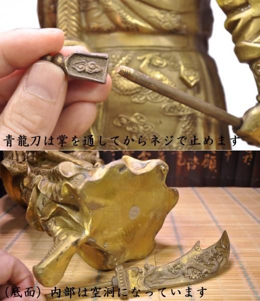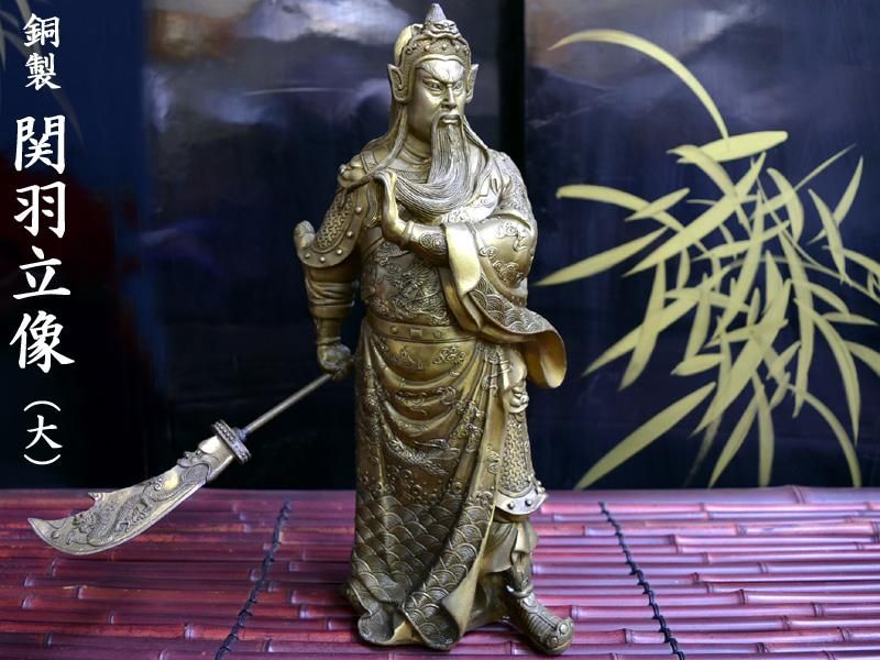 本商品は愛用の青龍刀を腰溜めに持ち、自慢の髭をしごく代表的なデザインの関羽の銅製立像です。高さ39cmの迫力の大きさです。青龍刀は柄の部分でネジ止め式になっています。三国志・関羽のファンの方以外にもオフィスや中華料理店などのインテリアにもおすすめです!