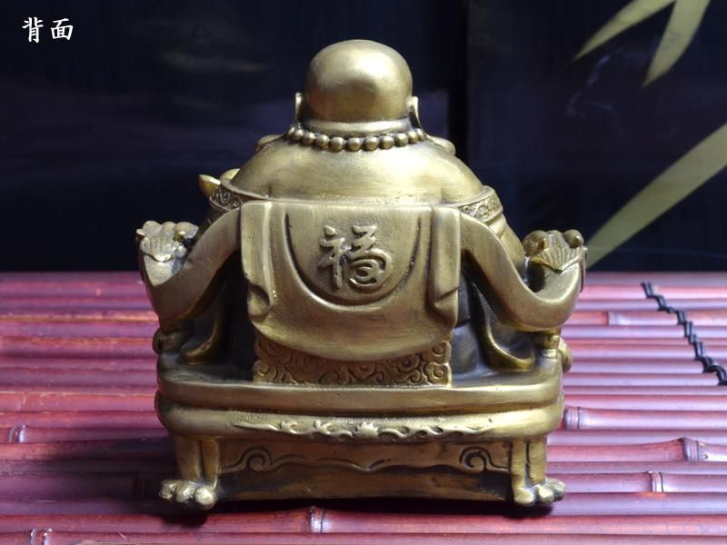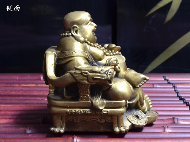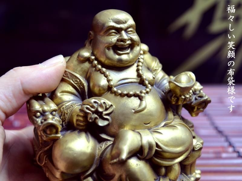布袋(ほてい)はその名の由来となる大きな袋を背負い、堂々たる太鼓腹が特徴の神様です。実際に存在した僧侶だと言う節も有りますが、日本では七福神の一柱、福の神として有名です。商売繁盛のご利益があるとのことで店舗の装飾にも人気が有ります。本商品は龍座に座る銅製の布袋像です。オフィスや中華料理店に飾ると商売繁盛をもたらすと言われます。