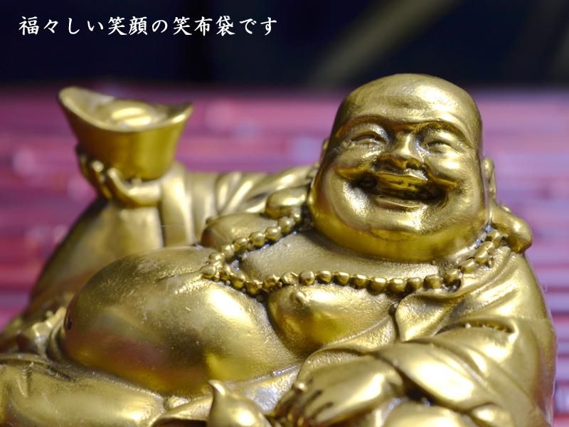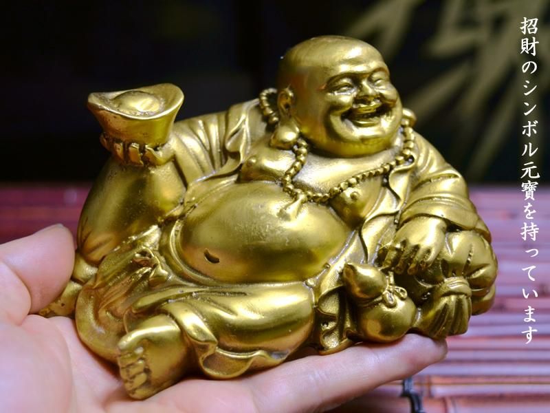 布袋(ほてい)はその名の由来となる大きな袋を背負い、堂々たる太鼓腹が特徴の神様です。実際に存在した僧侶だと言う節も有りますが、日本では七福神の一柱、福の神として有名です。商売繁盛のご利益があるとのことで店舗の装飾にも人気が有ります。本商品はゆったりとした姿勢で招財の元寶を持つ銅製の布袋像です。オフィスや中華料理店に飾ると商売繁盛をもたらすと言われます。