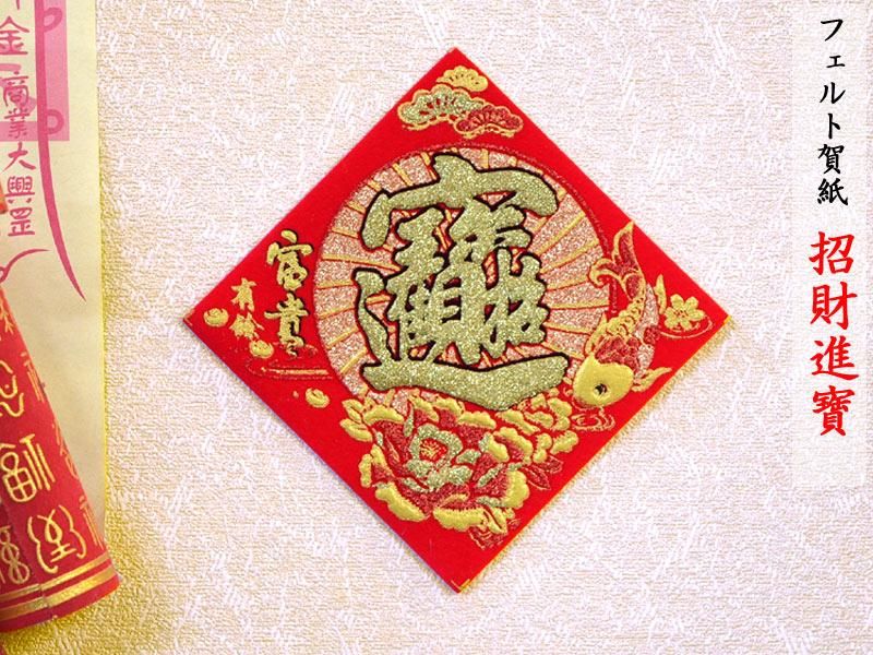 中国では壁に文字を張り、良い事が家に起こる様にと願を掛けます。赤地に金文字が一般的で、文字の回りは龍鳳や蝙蝠、桃などの有り難い吉祥のシンボルが配されています。これらを賀紙と呼びます。一般的に紙製が多い賀紙ですが、本商品はフェルト布で出来ていて、大変高級感が有ります。最も人気の【招財進寶】の組文字です。オフィスや中華料理店などの飾りに!