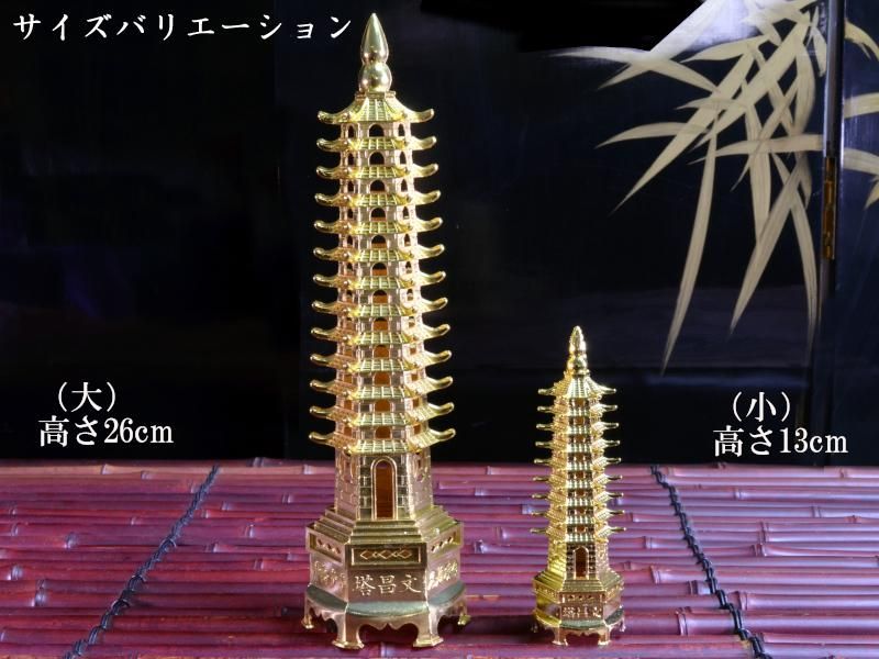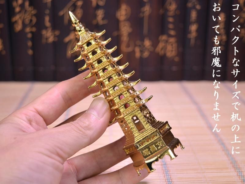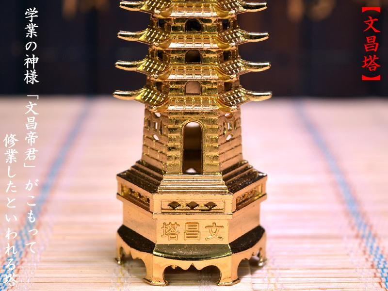 文昌塔は台湾などで広く信仰を集める学業・受験の神様「文昌帝君」がこもって修行したと言われる塔のことです。現在でも中国各地で見ることができ、通常は七層もしくは九層のものが多いです。この文昌塔を象った置物を書斎や勉強部屋に置くと集中力を高め、学業や仕事運をUPすると言われます。本商品は金の九層文昌塔です。金は中国では良い結果をもたらす色と言われています。小さいので机の上などに置いても邪魔になりません。受験や試験のお守りに大変人気が有ります。