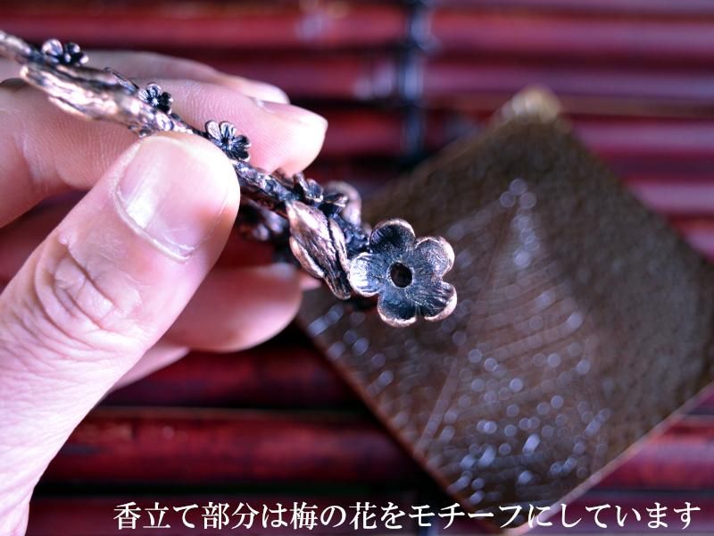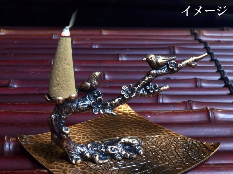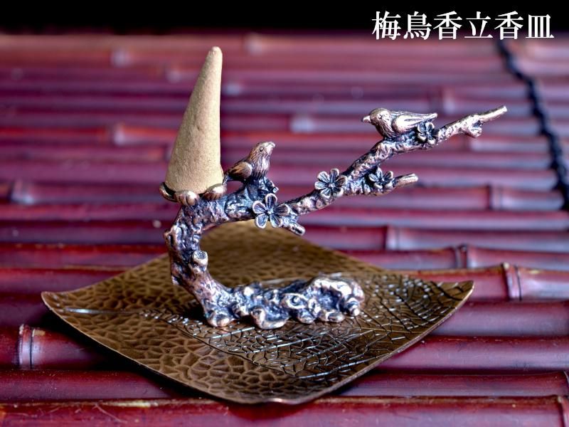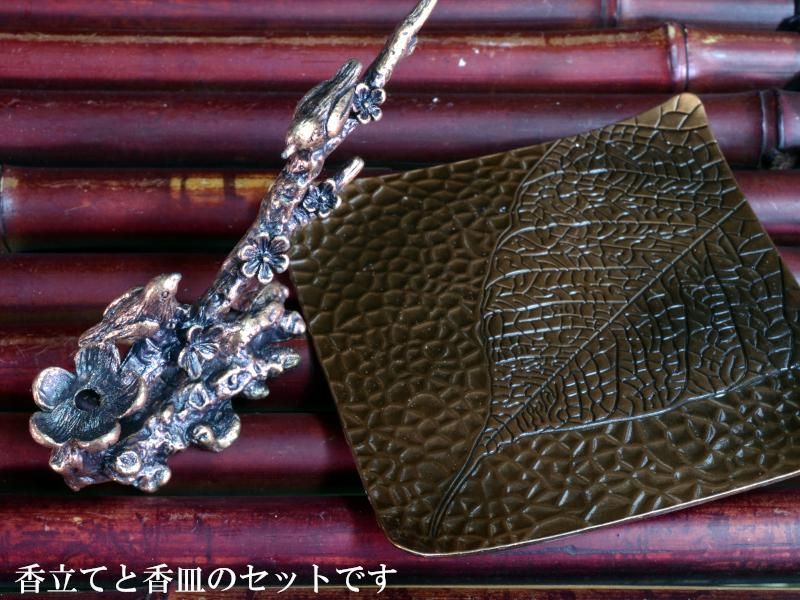 吉祥の梅鳥をモチーフにした香立てと葉をモチーフにした香皿のセットです。金属製の美しいデザインの香盆です。コーンタイプのお香を使用して下さい。【商品詳細】