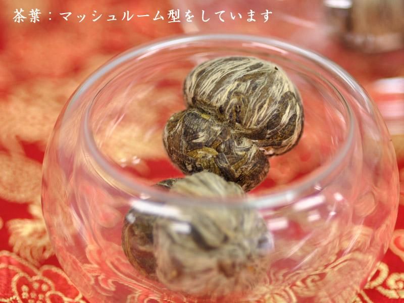 最近の中国茶ブームの中でも、特に人気が有るのが花入りの工芸茶です。ジャスミンの茶葉に色鮮やかな花々を閉じ込めたこれらの工芸茶は、中国の茶職人により、一粒一粒手作りで丹念に作られています。一人分ずつサーブでき、ガラスの茶器などに入れて茶葉が開いていく様子をお楽しみ頂けるため、高級中華料理店で、コースの最後にアクセントとして出されるお店が増えています。もちろん個人で飲むにも一回分だけお気軽に入れられ、また色々な形が楽しめるため、中国茶ファンに大変人気があります。本商品【秋韻風情】はマッシュルーム型の茶葉にお湯を注ぐと、ジャスミンの爽やかな香りが立ち上り、中から金盞花の花が現れます。ご自分で楽しむのもよし、中国茶館や中華料理店にも!