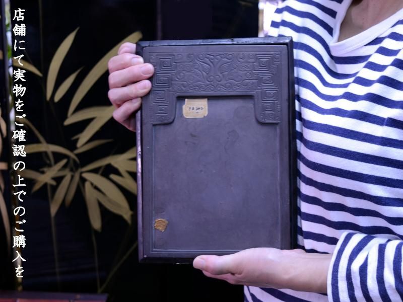 硯(すずり)は、墨を水で磨り卸すために使う、石で作った文房具です。中国では紙・筆・墨と共に文房四宝の一つと言われています。細かい彫刻や様々な意匠の彫刻を施した硯も多く見られます。本商品は魔除けの神獣饕餮が彫刻された古硯です。「鑑定」封蝋が押されていましたが半分はがれてしまっています。硯の詳細は不明です。経年による傷みがあるので店舗にて実物をご確認いただいた上でのご購入をお願いいたします。