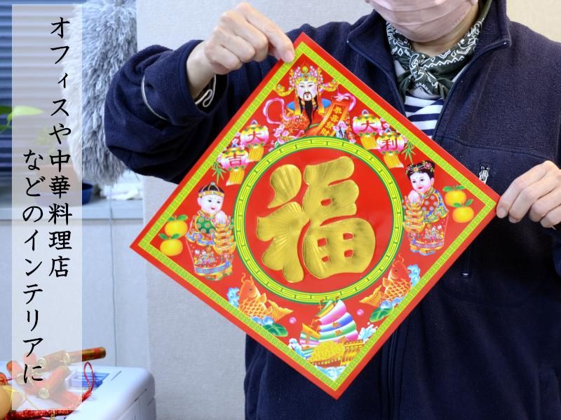 本商品は最も一般的な【福】の字で、周りに財神や唐子などのおめでたいモチーフが描かれています。オフィスのインテリアや中華料理店・茶館などの店舗装飾にもご利用頂けます。
