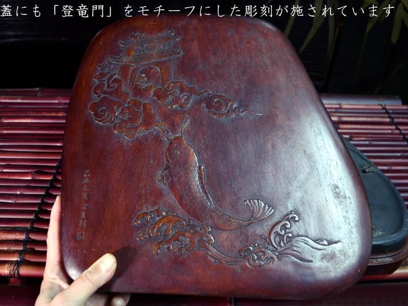 歙州硯は端渓硯と並び称される名硯です。上海南京市の南、歙(きゅう)県から掘り出される歙州硯は青みを帯びた黒色で、「羅紋」(らもん)と呼ばれるさざ波のような模様が特徴である。現存する歙州硯は少ないといわれています。本商品は鯉が激流を遡り、龍門と呼ばれる門を潜り抜ければ龍になれるという「鯉魚跳龍門(登竜門)」の故事をモチーフにした見事な彫刻が施された工芸歙州硯です。「金生利」という作家の作品です。箱蓋にも同様に登竜門をモチーフにした彫刻がさなれています。経年による傷や汚れなど傷みがありますので、できれば店舗にて実物をご確認いただいた上でのご購入をお願いいたします。