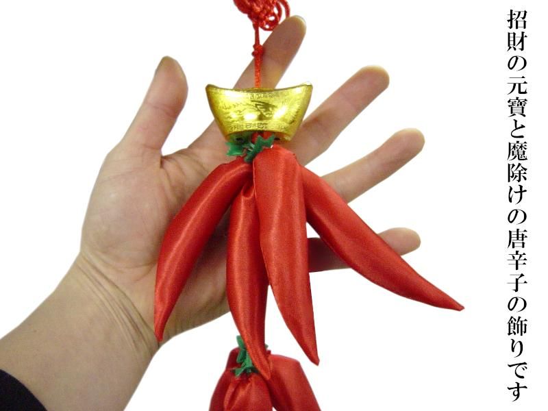 中国では古くから唐辛子には魔よけの効果があるとされていて、壁や窓際、出入り口の両側などに干した唐辛子を吊るす風習があります。吊るした唐辛子が落ちた分だけ厄が落ちると、いまでも中国の地方の民家などでは本物の唐辛子を干して吊るしていたりします。ただ現代住居の中では実際の唐辛子はインテリアにそぐわないということで、その気持ちだけを残して、飾り物を吊るし、魔よけにしています。本商品は魔除けの効果があると言われる唐辛子の上に、招財効果があるといわれる元寶まで付けた欲張りな飾り物です。唐辛子が布製で軽いので、気軽に壁に吊るすことができます。中華料理店などの店舗装飾にも人気が有ります。