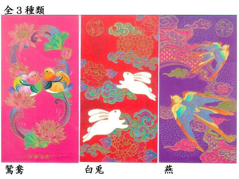 紅包(ホンバオ)は、中国で使われる紅いご祝儀袋のことです。お年玉だけでなく、結婚式やおめでたい宴会のとき、また子供にお小遣いをあげるさいなどに使われます。最近では赤くないデザインのものも増えています。本商品は吉祥の動物をモチーフにした可愛らしい紅包です。「鴛鴦」は〜恭喜発財〜、「白兎」は〜心想事成〜、「燕」は〜歩歩高升〜と書かれています。厚手のしっかりとした紙質で、ご祝儀、入学祝、就職祝いなど色々な用途でご利用頂けます。