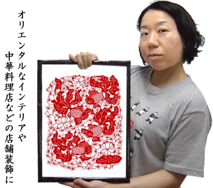 中国剪紙(せんし)は別名刻紙と言われる様に一枚の紙を一本の刃物で切り抜く中国の民間伝統芸術です。以前は中国でも大量に作られていましたが、現在はこのような伝統工芸品が廃れ、あまり作られなくなっています。【萬洪成】氏は中国剪紙学会や中国工藝美術協会、上海民間文芸協会などの会員で、中国剪紙の大家です。その作品は【萬氏剪紙】として日本でも人気が有ります。現在でも上海にアトリエが有り、訪ねていくとその場で実演販売をしてくれ、上海駐在の奥様方に大変人気のある作家です。こちらで紹介するものは、氏が1990年代に催事実演で来日した際の作品です。切り紙コレクターの方や、また店舗などの装飾などに大変人気がございます。本商品は「萬氏剪紙」のかわいい金魚をモチーフにした切り紙です。額などに入れてオフィスや中華料理店などのインテリアにも。