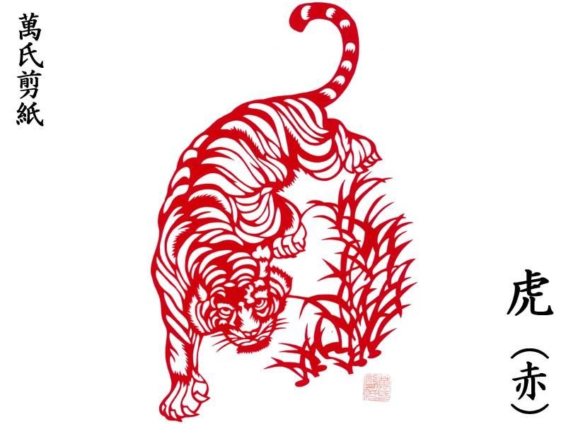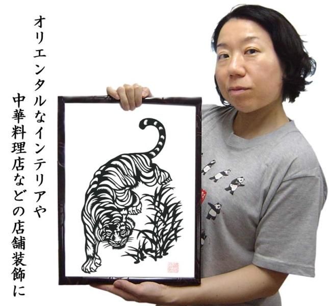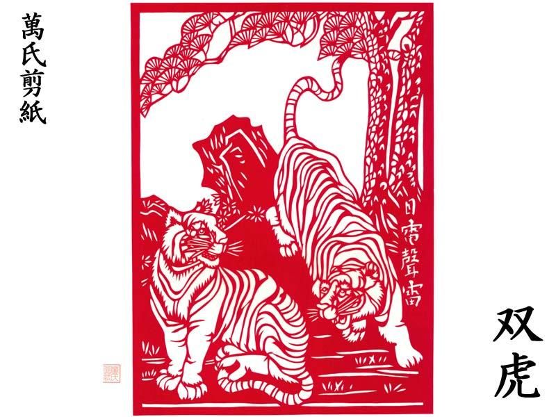 中国剪紙(せんし)は別名刻紙と言われる様に一枚の紙を一本の刃物で切り抜く中国の民間伝統芸術です。以前は中国でも大量に作られていましたが、現在はこのような伝統工芸品が廃れ、あまり作られなくなっています。【萬洪成】氏は中国剪紙学会や中国工藝美術協会、上海民間文芸協会などの会員で、中国剪紙の大家です。その作品は【萬氏剪紙】として日本でも人気が有ります。現在でも上海にアトリエが有り、訪ねていくとその場で実演販売をしてくれ、上海駐在の奥様方に大変人気のある作家です。こちらで紹介するものは、氏が1990年代に催事実演で来日した際の作品です。切り紙コレクターの方や、また店舗などの装飾などに大変人気がございます。本商品は「萬氏剪紙」の、虎をモチーフにした切り紙です。額などに入れてオフィスや中華料理店などのインテリアにも。