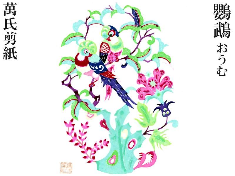 切り絵 中国 萬氏剪紙(彩絵)鸚鵡おうむ