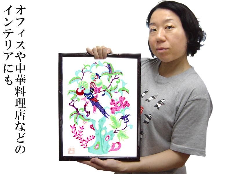 中国剪紙(せんし)は別名刻紙と言われる様に一枚の紙を一本の刃物で切り抜く中国の民間伝統芸術です。以前は中国でも大量に作られていましたが、現在はこのような伝統工芸品が廃れ、あまり作られなくなっています。【萬洪成】氏は中国剪紙学会や中国工藝美術協会、上海民間文芸協会などの会員で、中国剪紙の大家です。その作品は【萬氏剪紙】として日本でも人気が有ります。現在でも上海にアトリエが有り、訪ねていくとその場で実演販売をしてくれ、上海駐在の奥様方に大変人気のある作家です。こちらで紹介するものは、氏が1990年代に催事実演で来日した際の作品です。切り紙コレクターの方や、また店舗などの装飾などに大変人気がございます。本商品中国では吉祥のモチーフである鸚鵡を色付けで表現しています。額などに入れてオフィスや中華料理店などのインテリアにも。