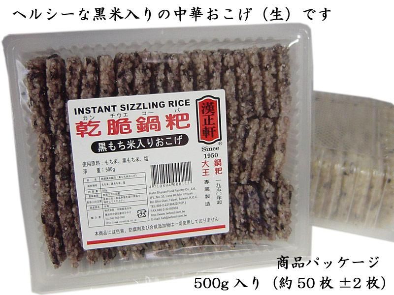 中華おこげは、もち米を油で揚げ、揚げ立ての内にお好みの餡をかけて頂く料理です。餡をかけるときの、ジュウっという音と、立ち上る湯気の香りで視覚と嗅覚も刺激され食欲をそそる人気の一品です。本品は台湾でメジャーなおこげメーカー【漢正軒】の黒米入り生おこげです。有名な中華料理店などでも使用される業務用500gパックです。
