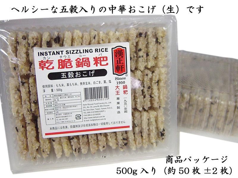 中華おこげは、もち米を油で揚げ、揚げ立ての内にお好みの餡をかけて頂く料理です。餡をかけるときの、ジュウっという音と、立ち上る湯気の香りで視覚と嗅覚も刺激され食欲をそそる人気の一品です。本品は台湾でメジャーなおこげメーカー【漢正軒】のヘルシーな五穀入り生おこげです。有名な中華料理店などでも使用される業務用500gパックです。