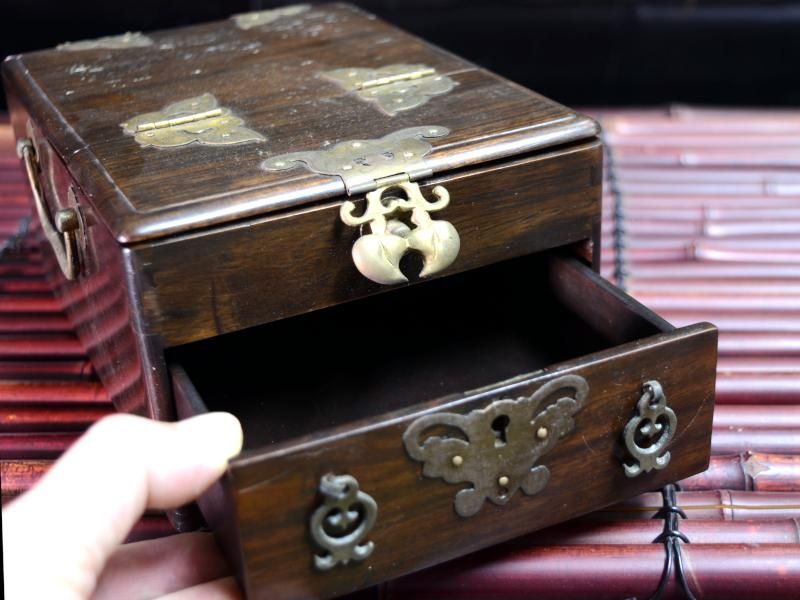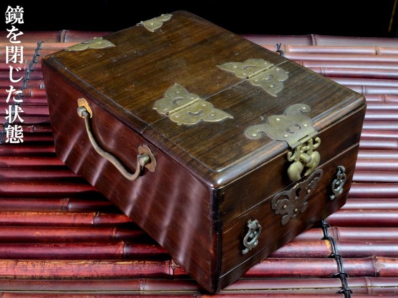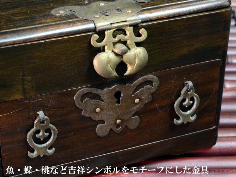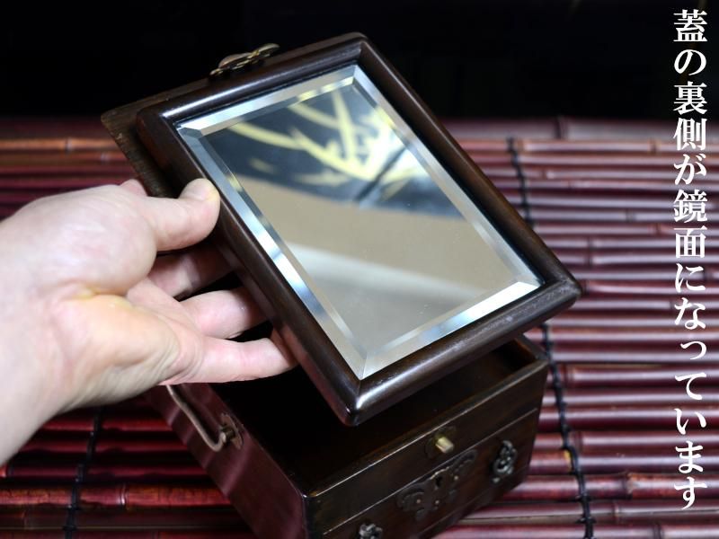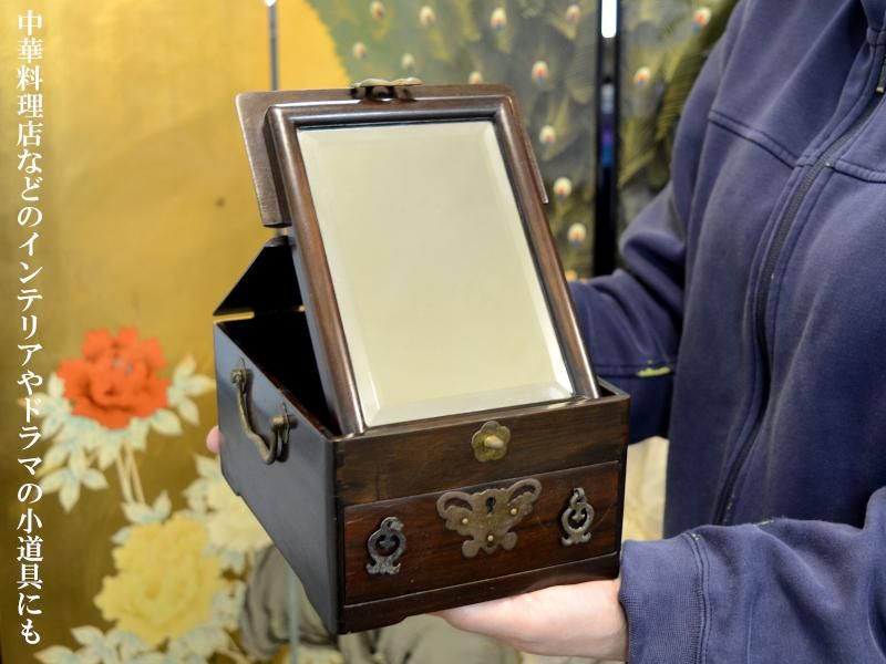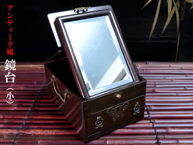 アンティーク風鏡台(小)です。蓋の裏側が鏡面になっていて、回転させると鏡台になります。引き出しが一つついており、内部に小物などを入れられます。金具部分は魚や蝶々、蝙蝠や桃など吉祥のシンボルをモチーフにしています。普段はアンティーク風の小箱に見えるので、インテリアや中華料理店などの店舗装飾、またドラマの小道具などにも薦めです。