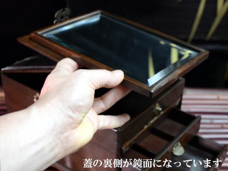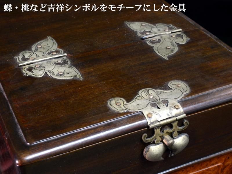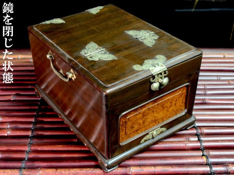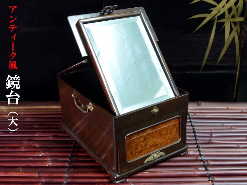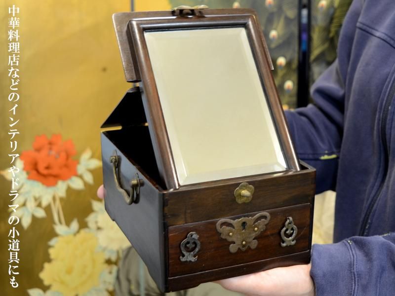 アンティーク風鏡台(大)です。蓋の裏側が鏡面になっていて、回転させると鏡台になります。引き出しが一つついており、内部に小物などを入れられます。金具部分は蝶々や桃など吉祥のシンボルをモチーフにしています。普段はアンティーク風の小箱に見えるので、インテリアや中華料理店などの店舗装飾、またドラマの小道具などにも薦めです。