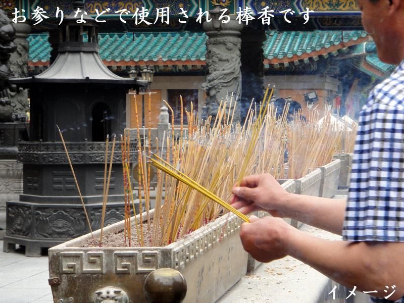 中国ではお香には邪気を払い、気を清める効果があると信じられています。本来仏教で使用されていたのですが、中国では民間・日常に広く浸透しています。毎日お香を焚き周囲を清めたり、また神様にお参りするときや、先祖の命日、お墓参り、お盆のときなどにも欠かせません。本商品は中国でお墓参りに行く際や清明と呼ばれる行事に使用される最もポピュラーな竹付棒香です。手持ちの部分が竹になっています。