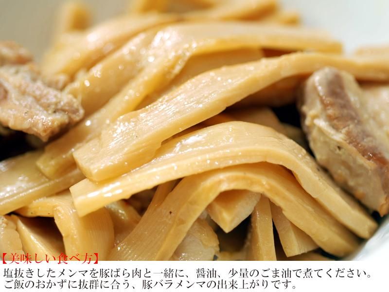 メンマはしゃくしゃくとした食感が特徴の中華食材です。日本では中華料理というよりは、ラーメンの具材やお惣菜として有名です。塩漬けなので調理する分量を水で充分に塩抜きしてから料理にお使い下さい。