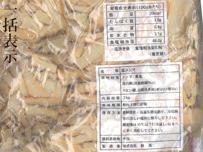 ・原材料 メンマ、食塩/漂白剤(次亜硫酸Na)、クエン酸、品質改良剤(ポリリン酸Na)