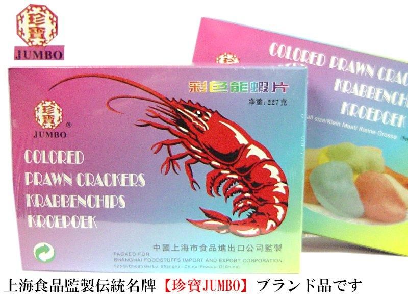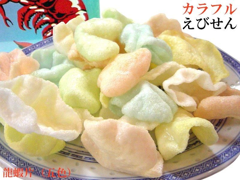 龍蝦片(エビせん)は、中国を代表するスナックで、蝦風味のせんべいです。中華料理ではエビチリなどに添えられて出てきます。脂っこい料理の口直しに蝦片を食べると口中の油分を吸い取ってさっぱりさせてくれます。また中華料理だけでなくインドネシアなどのアジア料理ではクルプックウダンと呼ばれています。もちろんそのまま食べても、ビールのおつまみなどに最適です。本商品はカラフルな5色のエビセンです。