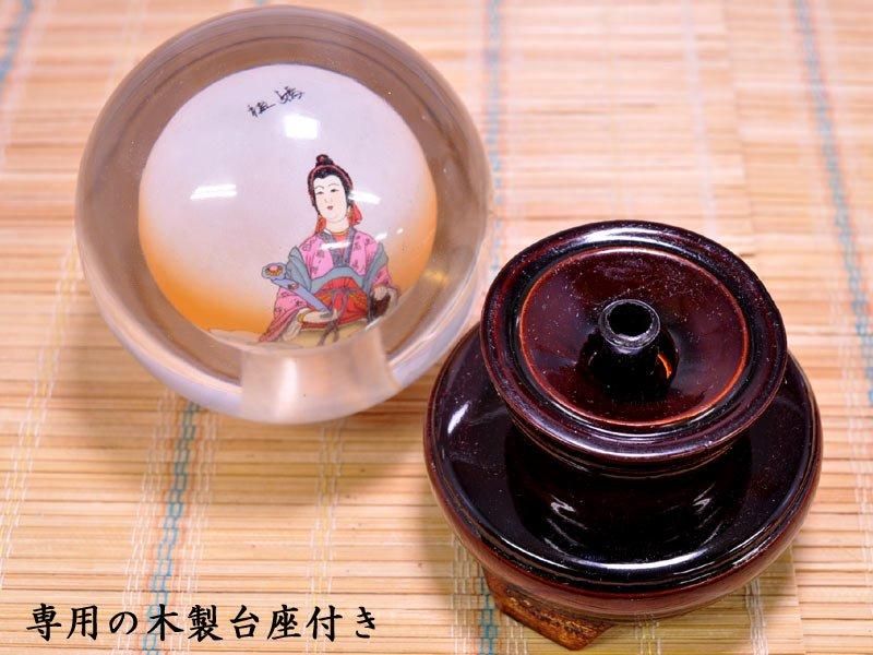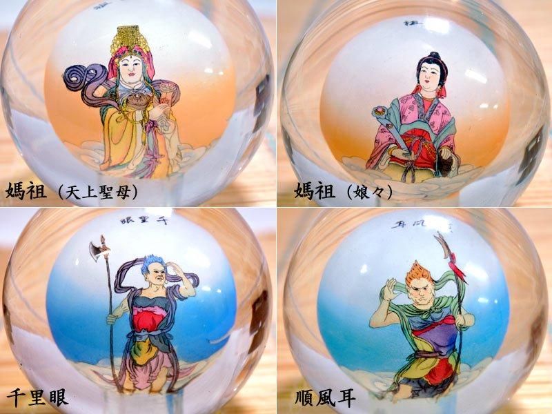 ガラス内絵は刳り貫いた硝子球の内部に筆を入れて、絵を描いていく中国の伝統工芸です。本商品は媽祖をモチーフにした硝子内絵です。媽祖は【媽祖(天上聖母)】と【媽祖(娘々)】の2タイプ、媽祖の脇侍のか【千里眼】、【順風耳】の4種類ございます。専用の台座は受軸部が回転します。オフィスや中華料理店などのインテリアにも!
