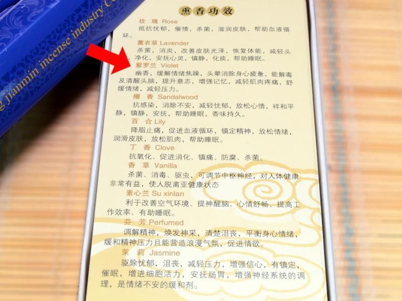 中国ではお香は大気中の不浄な成分を清め、魔除けの効果があるとされています。お香を焚くことによって集中力が高まり、精神を沈静化させ安定を保つと言われています。本商品は紫蘭(ヴァイオレット)の香りの短線香です。リラックス効果があると言われ安眠を促すと言われます。就寝時などに寝室で焚くと良いでしょう。
