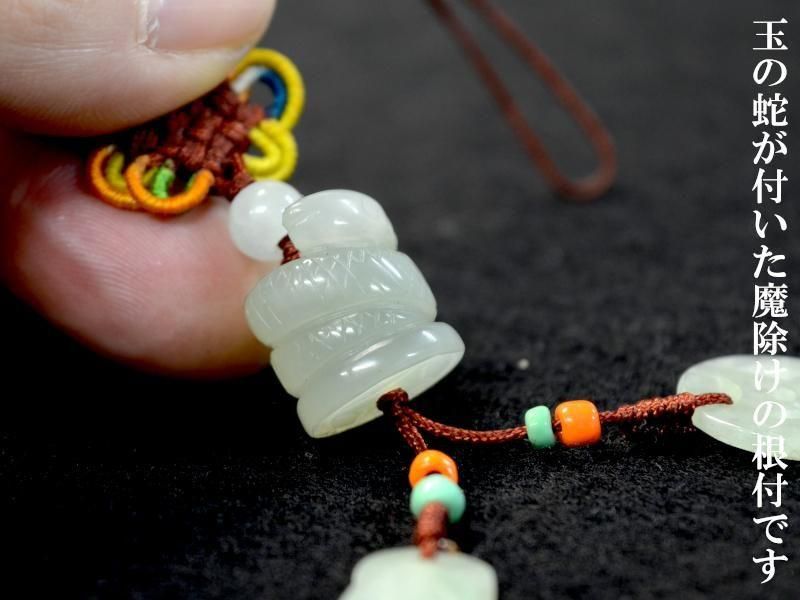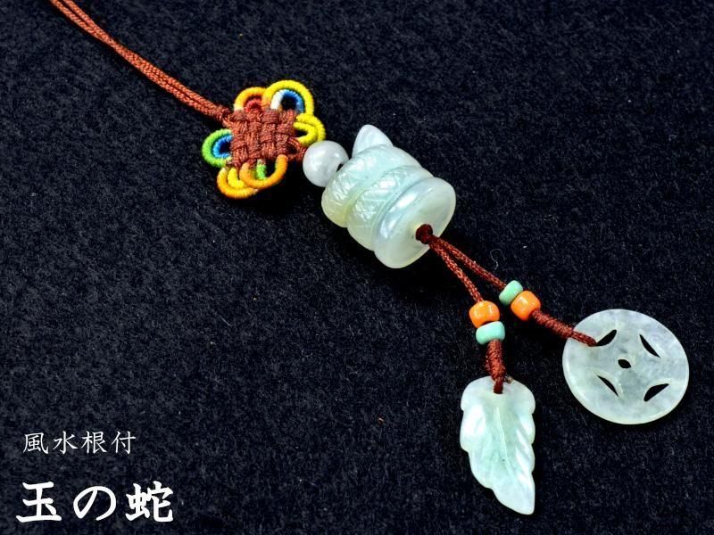 蛇は世界の各地で色々な言い伝えが有ります。脱皮を繰り返すことから中国では不死と再生のシンボルとされ、風水では蛇は招財のシンボルとして有名です。また悪い気を寄せ付けない、魔よけの効果もあるとされ人気があります。本商品は玉の蛇の風水根付です。上部には可愛い中国結び、下部には招財の古銭と健康の葉が付いています。