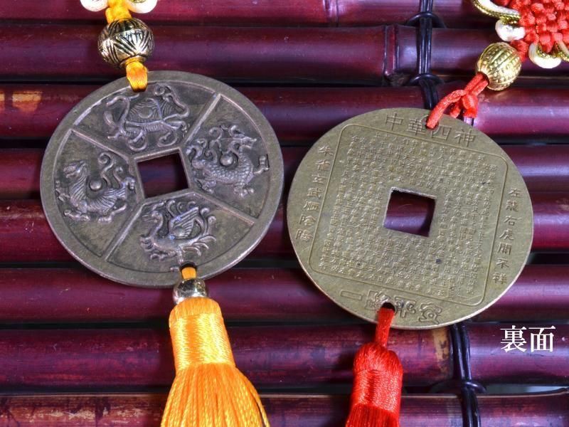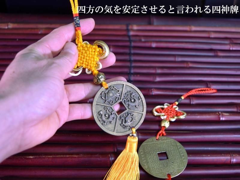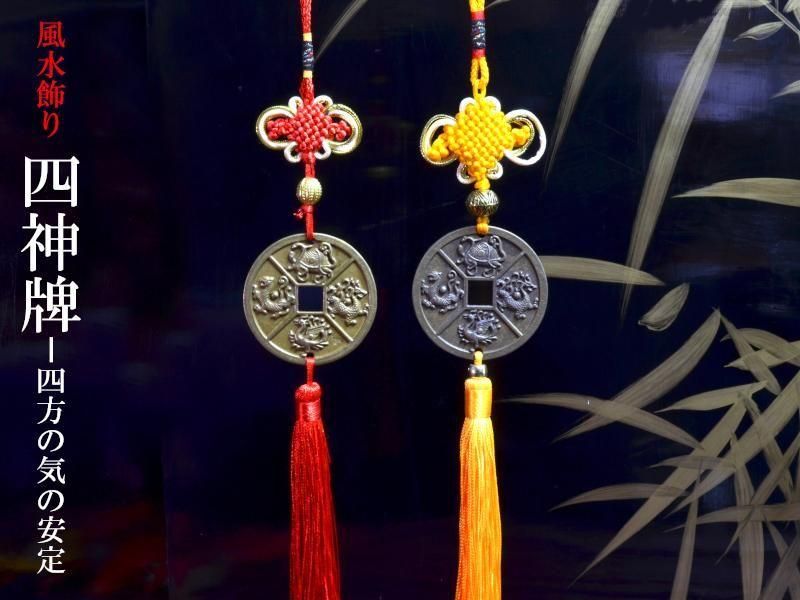 風水の元となる道教の陰陽五行では、全ての方位に神がいてその方角を守っています。曰く、東に「青龍」西に「白虎」、南の「朱雀」に北の「玄武」で四神となります。風水のそもそもの目的である大地の気(エネルギー)を逃がさないように捕らえる最高の地形、それが「四神相応」の地形です。現代ではそのような地形と巡り合うのは大変困難で、その代わり「四神」のグッズを使って邪気を払ったり、運気を高める一助にするのです。本商品は四神の力を刻んだメダルをモチーフにした風水飾りです。飾っておくと運気改善、気の安定に役立つと言われています。色は赤と黄色の二種類からお選び頂けます(中央の飾りはどちらも同様です)。